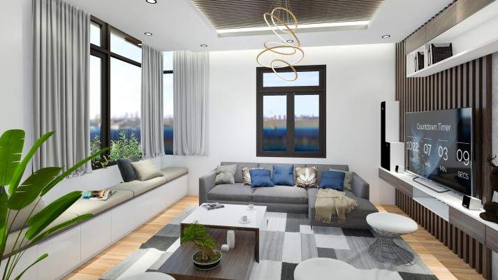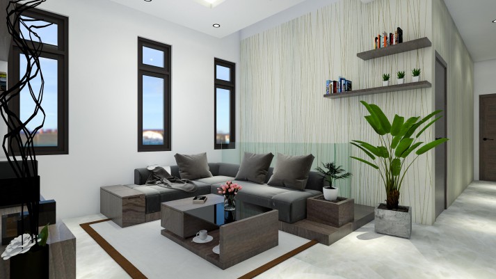 Thảm cao cấp, tủ, kệ đặt đồ trang trí, tủ sách, kệ tivi được sử dụng nhằm vào mục đích vừa phục vụ công năng sử dụng và trang trí thẩm mỹ. Không khí thông thoáng và ánh sáng tự nhiên cũng là những yếu tố quan trọng được quan tâm trong thiết kế nội thất phòng khách.